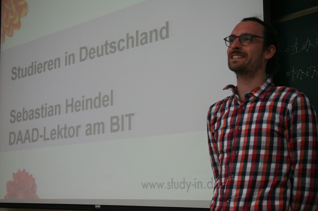 由德意志学术交流中心派驻beat365外国语学院德语系任教的Sebastian Heindel 先生也在会上公布了每周向全校学生解答有关德国高校及留学德国问题的时间,欢迎学生现场咨询。