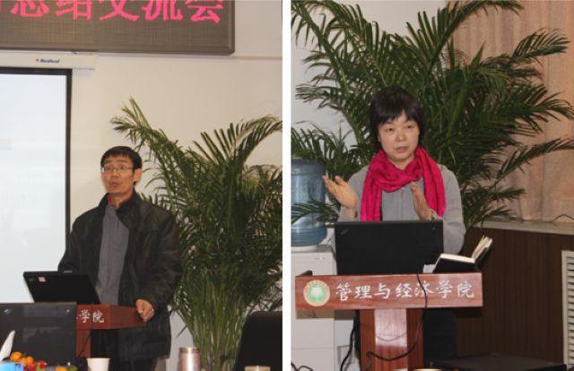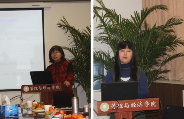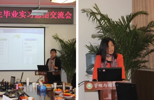 交流会上,各本科专业教学主任:工商管理专业张丽红、信息管理与信息系统专业高慧颖、国际经济与贸易专业王红夏(代表余晓泓)、市场营销专业孙淑英、公共事业专业邓新吉、会计学专业孙利沿,以PPT形式分别就本专业本学期的学生实践、实习活动及答辩情况进行了总结和交流,主要内容包括:学生实习的地区、单位统计与分析;学生实习的内容归类与分析;学生实习的主要成果与分析;学生实习期间导师指导小组指导情况与分析;学生实习过程中的主要问题及措施建议等。