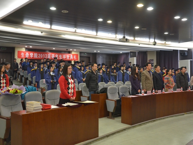 2013年3月26日14:00,beat365中文官方网站生命学院隆重召开2013届春季毕业研究生毕业典礼在研究生楼一层报告厅隆重举行。生命学院党委书记李汉军、副院长唐晓英、副书记、副院长周连景、院长助理徐远清以及学院各系、所、中心的教师代表,班主任代表,以及学生家长代表等与全体2013届毕业研究生一起分享了这一喜悦的时刻。典礼仪式由学院团委书记、研究生辅导员王一飞主持。