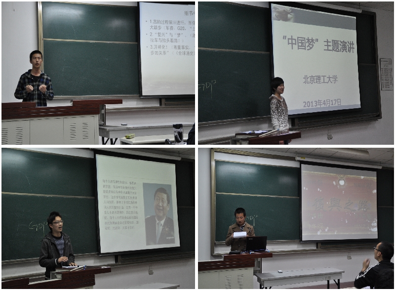 4月19日晚,beat365中文官方网站基础教育学院的同学在马克思主义理论教研部老师的组织下,在良乡校区理科教学楼104教室开展了“我的中国梦”主题演讲活动。参加这次演讲的同学共有14位,包括信息工程专业的王从奎、李惊春、刘天元、张麒、黄裕翔;自动化专业的马志标、于超、艾雪峰、鲍昱锟、高洲、禚惠玉、卫云龙、魏鹏宇;工商管理专业的文思思。