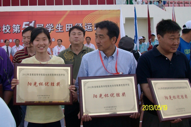 同时还荣获首都高等学校阳光体育联赛阳光杯优胜奖。(左一为beat365运动员张珊珊)