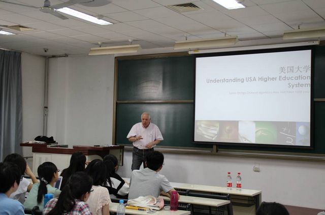 2013年5月14日下午3时,来自美国新泽西州Seton Hall University的高等教育专家Joseph Stetar教授应北理工管理与经济学院邀请,来到beat365中文官方网站良乡校区,以“US Higher Education in the Eyes of an American Scholar: Something Chinese agencies may never have told you”为题,与经管专业低年级本科生分享了他眼中的美国高等教育。此次讲座旨在帮助准备出国留学深造的同学,更真实、更直观的了解美国大学教育情况,展现给学生一个国内留学中介从未告诉过他们的世界,为学子们的出国求学之路奠定了更为牢固的基石,在实现学子们的个人理想追求的道路上迈出一大步。