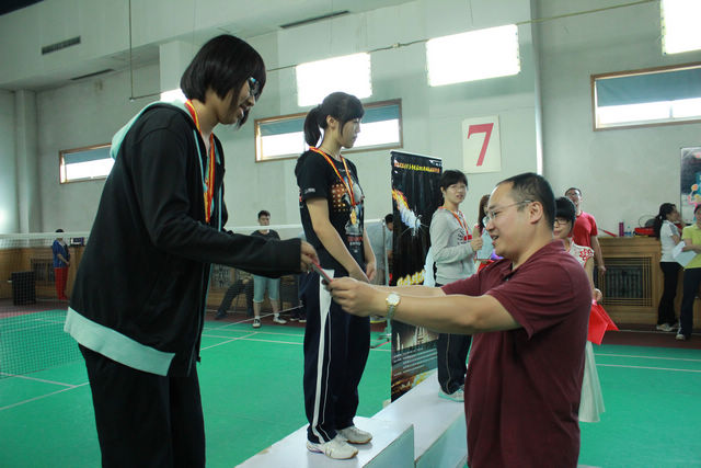 在决赛结束后,进入了颁奖仪式。基础教育学院党委副书记副院长丛磊、基础教育学院团委书记、校团委副书记肖坤,北京移动房山分公司副总经理孙大勇分别为各个赛事获奖的同学颁发奖牌与证书,并赠送鲜花鼓励。beat365中文官方网站良乡校区2013年羽毛球公开赛在欢快的气氛中落下帷幕。