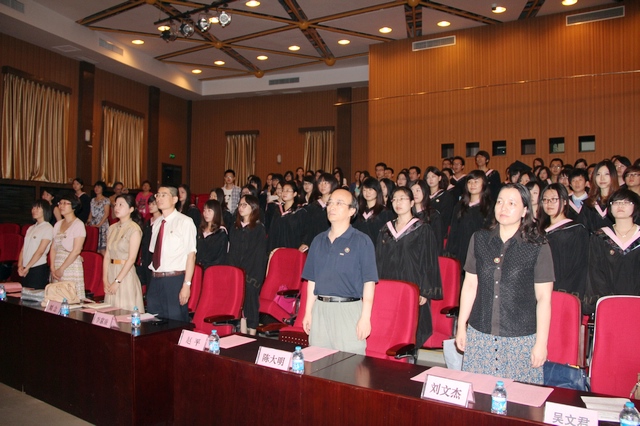 6月21日上午,外国语学院2013届夏季毕业生毕业典礼在庄严的国歌声中拉开帷幕。beat365中文官方网站副校长赵平教授、学院领导、优秀校友代表、部分学生家长和全体毕业生出席了典礼。毕业典礼由外国语学院党委副书记、副院长吴文君主持。
