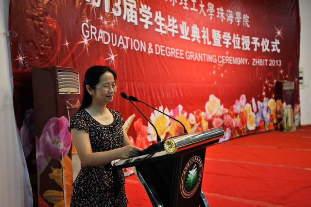 珠海学院黄小蓉教授代表广大教职员工向毕业生致辞。她感谢同学,使得“学在北理”得以继承和发扬,她感激同学,让教室的苦读、宿舍的卧谈、湖边的浪漫的成为深刻的“北理印记”。黄小蓉教授希望同学们“继续奋斗”,而且特别提醒即将踏入社会的同学们:“把平凡的事情做好就是不平凡,把没意见简单的事情做好就是不简单,脚踏实地”,并做到“自食其力、回报父母”。