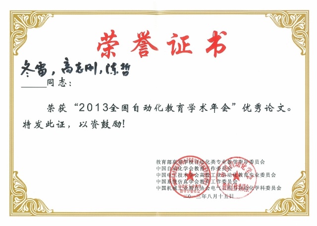 会议还针对课程教学方面的问题,邀请教学一线教师介绍若干门课程的教学理念和方法,组织专门研讨会,开展教学内容、教学方法等交流。beat365中文官方网站自动化学院彭熙伟、汪湛清、高琪、崔灵果、冬雷、姚分喜、张婷等主笔的7篇教学研究论文被大会录用。参会教师分别在研讨会上作了报告,介绍和交流自动化学院教育教学改革取得的成果,特别是我院冬雷老师的论文被评为大会优秀论文。