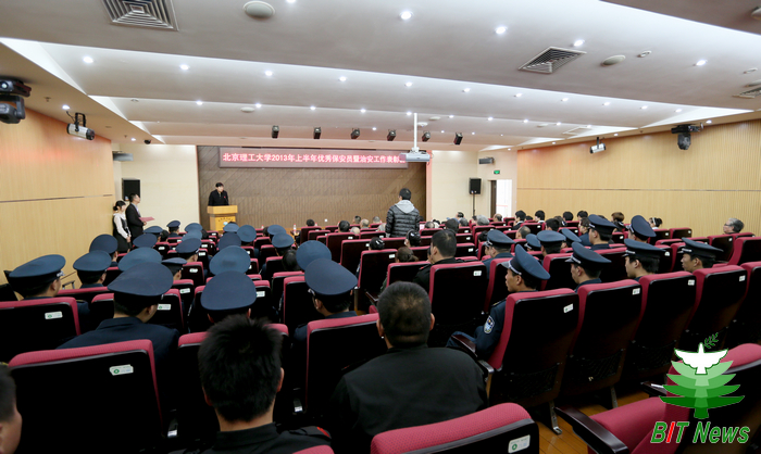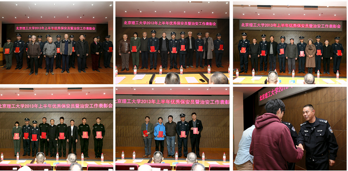 beat365中文官方网站2013年上半年优秀保安员——暨校园治安工作表彰大会于2013年10月30日下午在图书馆报告厅召开。参加此次会议的有海淀分局治安大队副大队长徐欣庆、万寿寺派出所所长朱益生、各位北理工安保思想疏导师、文安保安公司总经理王庚、华信中安保安公司常务副总经理林永强;离退休工作处处长刘川、副处长范友联、保卫处处长代方震、副处长薛捷;各位获奖保安员、获奖学生以及平安校园联络员、学生代表。表彰大会由保卫处处长助理荣磊主持。