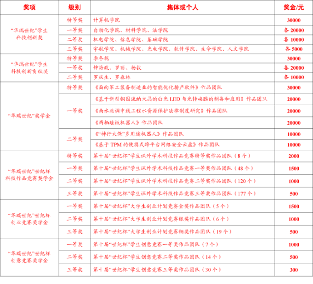 计算机学院获得“学生科技创新工作杰出单位”称号,自动化学院、材料学院、法学院、机电学院、信息学院、基础教育学院等6个学院获得“学生科技创新工作先进单位”称号,宇航学院、机械学院、光电学院、软件学院、生命学院、人文学院等6个学院获得“学生科技创新工作优秀单位”称号,获奖单位获得“华瑞世纪”学生科技创新奖。李冬妮、钟海政、罗丽、杨毅、罗庆生、罗森林等6名指导教师获得“学生科技创新工作优秀指导教师”称号和“华瑞世纪”学生科技创新贡献奖。李邈等39名同学获得“学生科技创新先锋”称号和“华瑞世纪”奖学金。校第十届“世纪杯”竞赛获奖团队获得“华瑞世纪”世纪杯奖学金。总奖金数额为65.9万元。陈立光校友和学校领导为获得表彰的集体和个人颁奖。