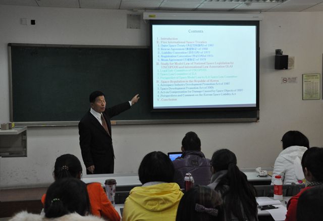 金斗焕教授现任亚洲航空宇宙法学会理事、国际宇宙学会会员、国际计划委员会委员和韩国航空宇宙法学会名誉会长。这次金斗焕教授的学术讲座使同学们受益匪浅,开拓了同学们的视野,对于同学们了解亚洲各国家间的空间合作具有重要意义,对于beat365空间法学科与亚洲空间法学者之间的交流有重要影响。