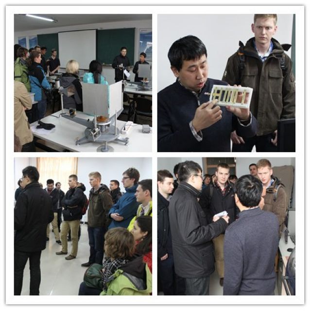 其后,德国学生代表团又来到微波技术研究所,胡冰老师向德国学生展示了其中的三个实验室,并详尽地介绍了导行电磁波测量的相关实验设备与微波电路制板机的工作原理、使用方法等。