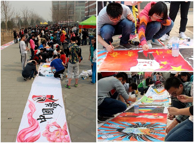 3月25日中午,良乡校区85支参赛队伍、400多名同学在百米长卷上充满激情地挥洒泼墨,书画他们对“美丽中国梦”、“奋斗的青春”的理解和追求。