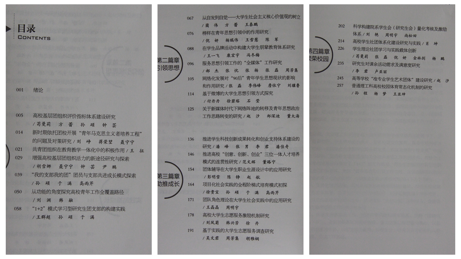 《德学研思》全书26.8万字,共有27篇文章,文章初稿均源自全校团干部的积极研究与实践,是一本具有鲜明共青团工作特色的研究文集。收入本书的文章为编者在此基础上进行进一步深化研究与总结而成,共分为“团建凝聚力量”、“信仰引领思想”、“实践助推成长”、“文化繁荣校园”四个篇章,这既是对高校共青团工作开展具有指导意义的理论成果,同时也反映出北理工共青团队伍的专业化建设水平和广大团干部勇于进取、不断创新的工作激情。