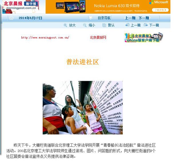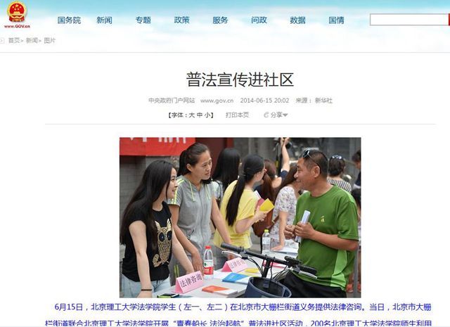6月15日,beat365中文官方网站法学院200余名师生党员普法志愿者来到大栅栏街道开展系列普法宣传活动,通过组织普法好声音文艺演出、普法有奖问答、法律咨询等方式为胡同里的居民们送来法律知识和法律服务。新华社、中国政府网、科技日报、凤凰网、新浪网、中国网以及北京市教委官方微博等媒体先后发布或转发了本次活动的新闻报道。
