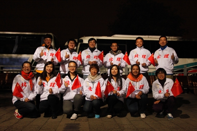 清秋凌晨的京城,已夹带丝丝寒意。凌晨两点,穿着统一白色服装、胸前印着醒目“北理”二字的170名师生准时在理工大学门口集合,由校团委书记蔺伟带队乘车前往那见证无数历史性时刻的天安门广场。凌晨的北京,秩序井然,给人一种庄严之感,一路上,车里都很安静,大家都在静静地看着,体味着,思考着,感动着——这是一种深沉的情感,是对六十五周年国庆的祝贺,是对祖国繁荣昌盛的礼赞,是为我们这样一个伟大的国度而产生的深深自豪。