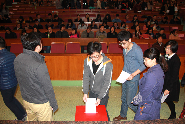 设计学院党员们严肃认真的选出了自己推荐出席校党代会的学院代表,并郑重的将选票投入到票箱中。