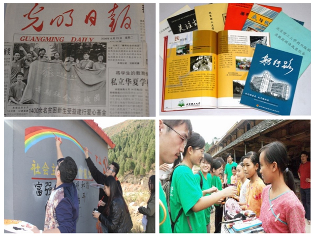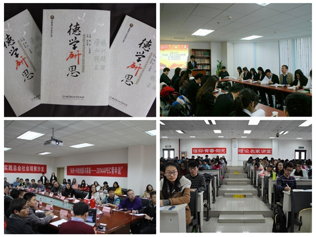 。。强调一、二课堂结合,实现校院两级联动,建立起“以暑期社会实践为主体,以寒假社会实践为补充,以周末社会实践为纽带”的全程化社会实践格局,实现对学生的全覆盖,在实践中引导学生加深对社会主义核心价值观的理解。2014年寒暑期社会实践活动均以“践行社会主义核心价值观”为主题,包括“传统文化教育”、“专题社会调研”、“志愿公益服务”、“深度体验观察”、“探寻校友足迹”、“母校招生宣传”多种实践组织模式,涌现出多个成果突出的特色品牌实践团队。其中,机电学院青海加汝尔小学支教团、管理与经济学院灵青护航者队支教团等志愿公益类团队,均在实践服务的过程中加入“社会主义核心价值观”的元素,通过文艺演出、宣讲会等方式在群众中进行宣传。而机械学院“中国梦筑梦乡村实践团”、人文与社会科学学院“首都市民思想政治道德影响因素调查团”等团队,则以社会调研、学习研究的方式,深入学习社会主义核心价值观的重要内涵,并凝练实践成果,将其内化于心,作为自己学习、生活、科研的行为准则。