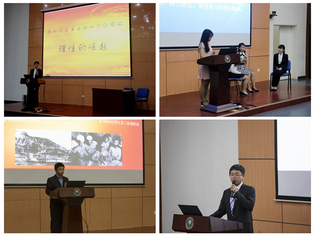 机械与车辆学院机械先锋队从也门撤侨事件入手,与印度撤侨进行了对比,结合社会主义核心价值观的践行,提出了践行社会主义核心价值观要实现理性崛起的命题。人文与社会科学学院青马讲师团采用“锵锵三人行”节目访谈的新颖形式,印证了延安精神与社会主义核心价值观在校园中的传承和践行。光电学院的华光社以“寻理工足迹,传京工文化”为题,以延安为源头,为同学们深入解读了beat365中文官方网站的校史和校园文化精神。计算机学院新青年队以“普世价值的广泛性与西方制度的局限性”为题,阐释了普世价值与西方制度的根本区别。
