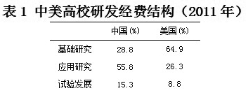 根据美国国家科学基金会(NSF)的数据,美国高校基础研究经费占研发经费的比重多年来一直在三分之二左右,应用研究占到约四分之一,而试验发展所占比重徘徊在8%上下。2011年,我国高校研发经费中,基础研究经费低于同年美国高校36个百分点;应用研究经费高出近30个百分点;试验发展也明显高出。这“一低两高”的显著差异,充分表明中美两国高校研发重心的不同,美国高校更加侧重于基础研究,我国高校在应用研究和试验发展上的投入更多。