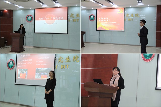 11月10日,北理工红色“1+1”活动总结评审会在研究生楼305会议室顺利召开,党委组织部、校团委、党委研究生工作部和学生工作部相关负责人出席并担任评委。