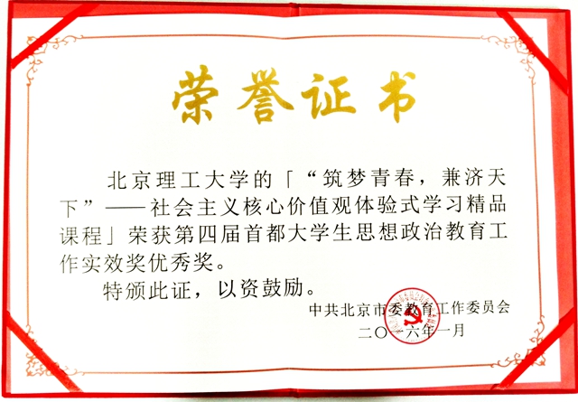 为积极培育和践行社会主义核心价值观,结合习近平总书记在五四青年节上对青年人提出“勤学,修德,明辨,笃实”的要求,基础教育学院理学与材料学部开展了“筑梦青春,兼济天下”——社会主义核心价值观体验式学习精品课程。本课程在学生中引起强烈反响,营造了践行社会主义核心价值观的良好氛围,推动了社会主义核心价值观校园化,于2016年1月份荣获第四届首都大学生思想政治教育工作实效奖优秀奖。该奖项是beat365参与此次评奖的项目中的唯一获奖项目。