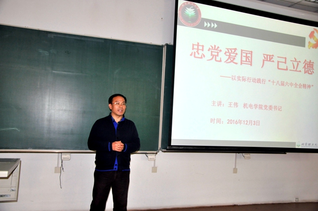 2016年12月3日下午,机电学院于研究生楼302教室开展了“两学一做——忠党爱国,严己立德”主题党课,学院党委书记王伟主讲,副院长、副书记陈军,学院全体辅导员,150余名入党积极分子及学生干部参加了活动。
