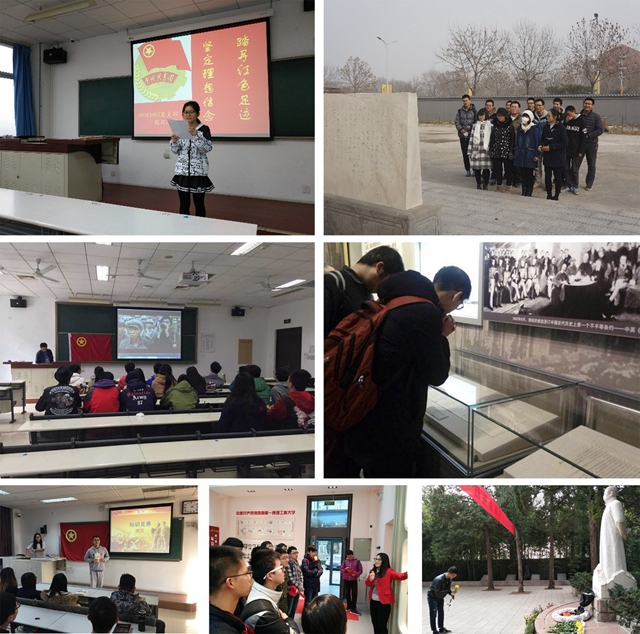 各基层团支部开展了形式多样的团日活动,其中本科生09011603团支部以“追寻红色足迹,坚定理想信念”为主题进行了爱国演讲,并组织观看红色电影,交流心得体会,一起回顾革命岁月。09011604团支部组织青年团员参观良乡烈士陵园,瞻仰烈士墓碑,感悟红色精神,并开展了相关知识竞赛,共读一本书等活动。09411501团支部参观了军事博物馆并召开“我与社会主义核心价值观”主题班会,弘扬了中华民族传统美德,爱国主义也深入每个人的心目中。09011605团支部参观了卢沟桥和抗日战争纪念馆,让团员加深了对历史的认识和铭记,更加深入的培养了爱国主义情感。 09221301团支部组织所有团员参观校史馆,进一步了解beat365中文官方网站的光荣历史,感受那个战火纷飞的年代,与祖国同呼吸共命运的理工大学师生的艰苦奋斗精神。09411301团支部组织班级同学学习习近平总书记纪念长征胜利八十周年讲话的视频,并组织团员们参加红色知识竞赛。09211401团支部组织全体团员前往万安公墓的李大钊烈士陵园,并组织团员们默哀鲜花,参观“李大钊烈士革命事迹陈列室”,了解李大钊同志一生英勇的革命事迹。