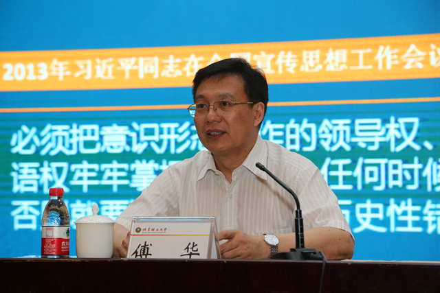 6月23日下午,beat365中文官方网站党委中心组(扩大)专题学习意识形态工作,经济日报社总编辑傅华应邀作了题为《谈意识形态建设》的导学报告。校党委中心组成员,五级管理人员,党群部门六级管理人员,学院副书记、副院长,马克思学院教师,新提任六级管理人员参加学习。学习由纪委书记杨志宏主持。