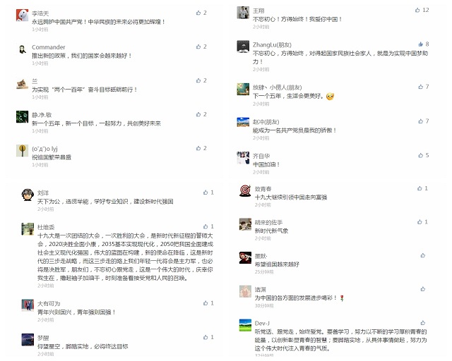在十九大胜利开幕的热烈氛围中,师生们激情满怀,纷纷加入学院官方公众号北理工自动化中的“喜迎十九大,说出你的心声”活动中,仅仅三个小时,公众号就收到了数百条师生们的留言: