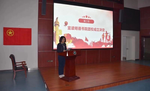 为深入学习贯彻习近平新时代中国特色社会主义思想和党的十九大精神,切实落实团的十八大精神学习宣讲工作,帮助明德书院广大团员坚定正确的政治方向,形成强大的向心力、凝聚力,树立新时代共青团员形象,明德书院团委决定于11月1日正式成立团校,以多形式、多内容对共青团干部、团员青年进行全覆盖式培养。明德书院团委书记王一飞宣读了《共青团beat365中文官方网站明德书院委员会成立团校的决定》。