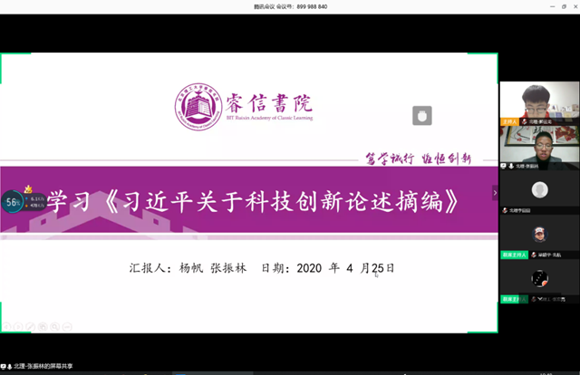 睿信书院学生党员郭云龙、06911801团支部赵居甲带领大家学习了习近平总书记给北京大学援鄂医疗队全体“90 后”党员的回信及“90 后”党员的先进事迹。 学生党员杨帆、张振林领学了《习近平关于科技创新论述摘编》,对与青年科技创新有关的内容进行了重点解读。