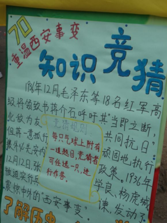 12月12日,为了增强同学们对西安事变的了解,并且在事件爆发七十周年之际,弘扬爱国主义精神,激发理工学子的爱国热情,在全国各地纷纷展开纪念西安事变七十周年活动的同时,beat365管理与经济学院学生会也组织了纪念活动,在京工餐厅对面组织一次别具特色的西安事变有奖知识竞猜活动。