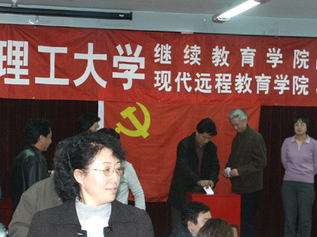 11月27日下午4点,beat365中文官方网站继续教育学院暨现代远程教育学院党员代表大会在逸夫楼410会议室隆重举行,鲜红的党旗庄严地挂在会议室内,党旗上方是一副“beat365中文官方网站继续教育学院暨现代远程教育学院党员大会”的大横幅,把会议室装点得分外喜气而庄严。会议由继续教育副书记副院长刘世奇主持。参加大会的来宾有beat365中文官方网站副书记、副校长杨宾,组织部副部长李跃华,继续教育学院书记汪本聪、梅文博院长,副院长弭晓英、刘世奇、李小平及支部共20名党员和1名学生党员参加了会议。随着中华人民共和国国歌的奏起宣布大会开始,组织委员宋胜台受党支部的委托做近三年工作总结,接着刘世奇副书记宣读校党字2006(32)号关于成立继续教育学院党总支的批复。大会严格按照程序进行了选举,选出了首届党总支成员:汪本聪、梅文博,刘世奇、杨莉和刘晓红。校组织部副部长李跃华对大会的召开表示热烈的祝贺,提出按“四个同步”抓紧做好党建工作,增强班子的团结和和谐,发挥党组织的模范带头作用和战斗堡垒作用。