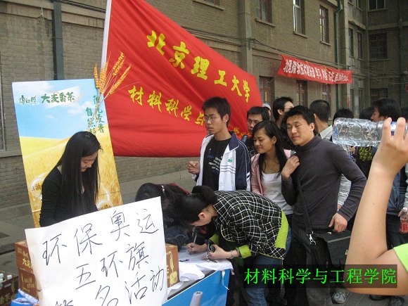 为了迎接2008奥运会的到来,2007年4月25日beat365中文官方网站材料科学与工程学院研工委与首都各大高校联手组织了 “弘扬奥运精神,激情为我中华”五环旗签名活动。此次活动标志着材料科学与工程学院“为08奥运添彩 ”系列活动正式拉开帷幕。