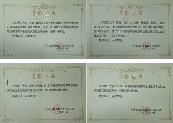 本次评选活动共有来自北京市的34所高校参与,共提交162篇社会实践论文,经专家评审,评选特等奖论文8篇,一等奖论文16篇,二等奖论文25篇,优秀指导教师16名,9所高校荣获优秀组织奖。由北理工马研部教师刘婧指导,王朔、崔梦林等撰写的论文《基于手机媒体的大学生思想政治理论课移动学习有效性探究》在本次评选中荣获特等奖。该课题依托指导教师的科研项目,充分发挥学生的专业特长,从实证探究角度出发,综合运用问卷调查和质性访谈等方法,创新设计引导体验、微信平台探究两项实验,针对大学生应用手机进行思想政治理论课移动学习的现状、问题进行深入研究,提出了一系列可行建议和合理设计,旨在推动基于手机媒体的移动学习为思想政治理论课的改革创新提供动力。