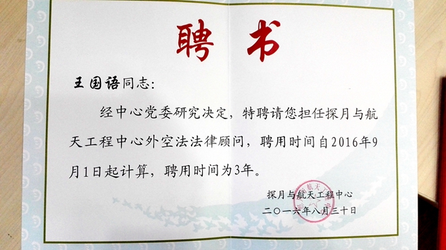 国防科工局探月航天工程中心(中心)聘请法学院王国语副教授为外空法法律顾问,2016年9月18日,王国语应邀参加了中心的聘用仪式。