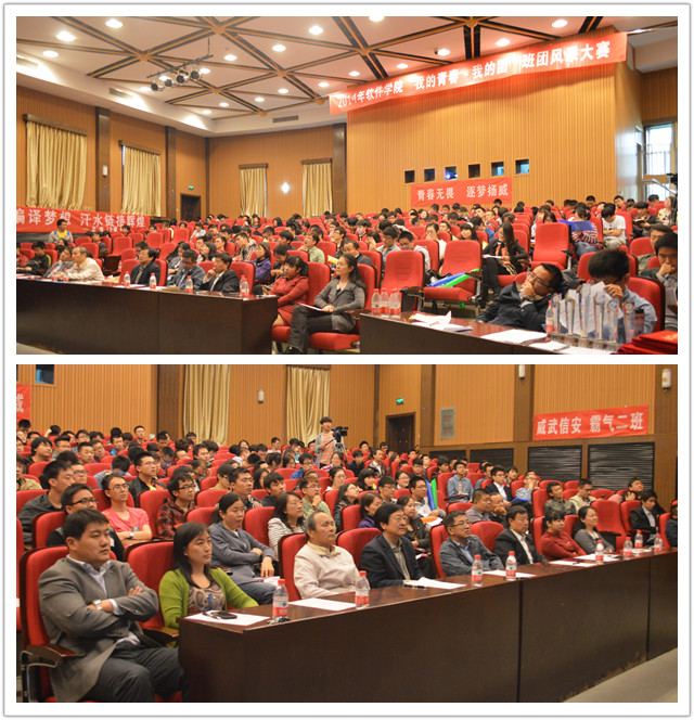 下午14时,主持人宣布2014年软件学院“我的青春•我的团”班团风采大赛决赛正式开始。此次大赛具有很多软件学院的特色,比如大众评审投票系统和计票统计系统都是学院科技创新创业实践基地自主设计研发而成,体现了软件学子追求卓越的科研态度与的高超的技术与独特的创新能力。