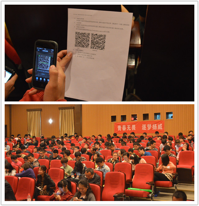 大赛进入最激动人心的现场评委投票环节,在场的同学需要扫描传单上的二维码下载软件学院同学们自主设计研发的投票系统,以软件学院办公平台的身份进行登录,每人有四票,需要投给四个不同的团支部。