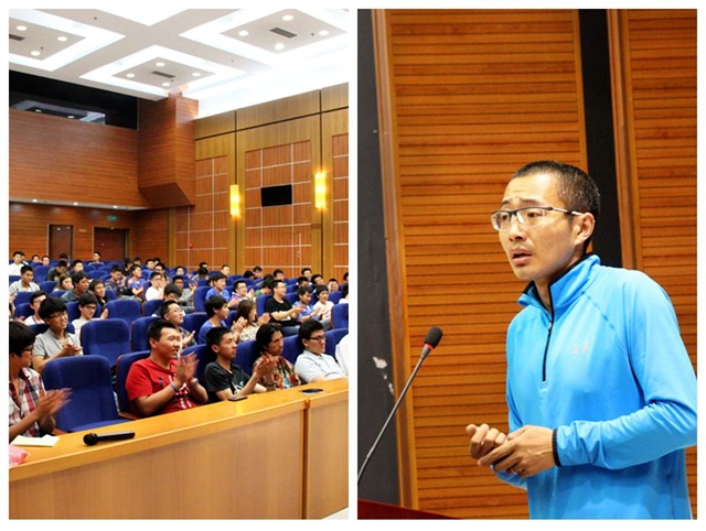 下午三点,于嘉老师穿着一身亮眼的蓝色运动装出现,颇有职业马拉松运动员的气质。他的到场也迅速掀起了全场观众热烈的气氛。讲座中,于嘉老师以平实、简单又不失幽默的语言结合切身的经历和体验讲述了自己与马拉松运动的不解之缘。