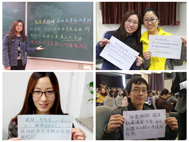 在“代言”活动中,学院全体团员青年以社会主义核心价值观的24字为基本内容,用当下流行的“价值观体”写下了自己对社会主义核心价值观的理解,用自己的行动为社会主义核心价值观做代言。数百名团员青年的代言照片被制作成巨幅海报,营造了良好的学习氛围。在代言的过程中,团员青年对社会主义价值观的理解更加深入,也深刻的感受到了当代大学生的使命感和责任感。