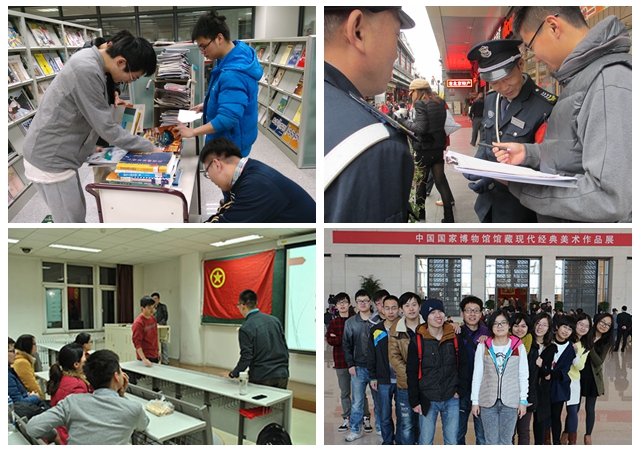在“践行” 活动中,各团支部通过探访典型人物、走进社区开展各种爱心公益活动以及开展传统文化主题讲座、知识竞赛等具体方式,将社会主义核心价值观落到到了实处。2014级硕士1班团支部开展了“我的核心价值观”知识竞赛,以生动的形式传播了社会主义核心价值观;09311202班团支部集体参观了中国国家博物馆的复兴之路展览,对我国的民族复兴历程有了深刻的认识;09311101和09221101团支部利用课余时间到学校图书馆清理占座图书,用实际行动践行了社会主义核心价值观;09311201团支部进行了“关注地铁涨价”和“关注雾霾”调研活动,同学们在魏公村等地铁站通过问卷调查的方式调研了公众对于地铁涨价这一热点话题的看法,同时,他们还在朝阳公园等对游客进行了采访,探讨雾霾对于大众的影响。