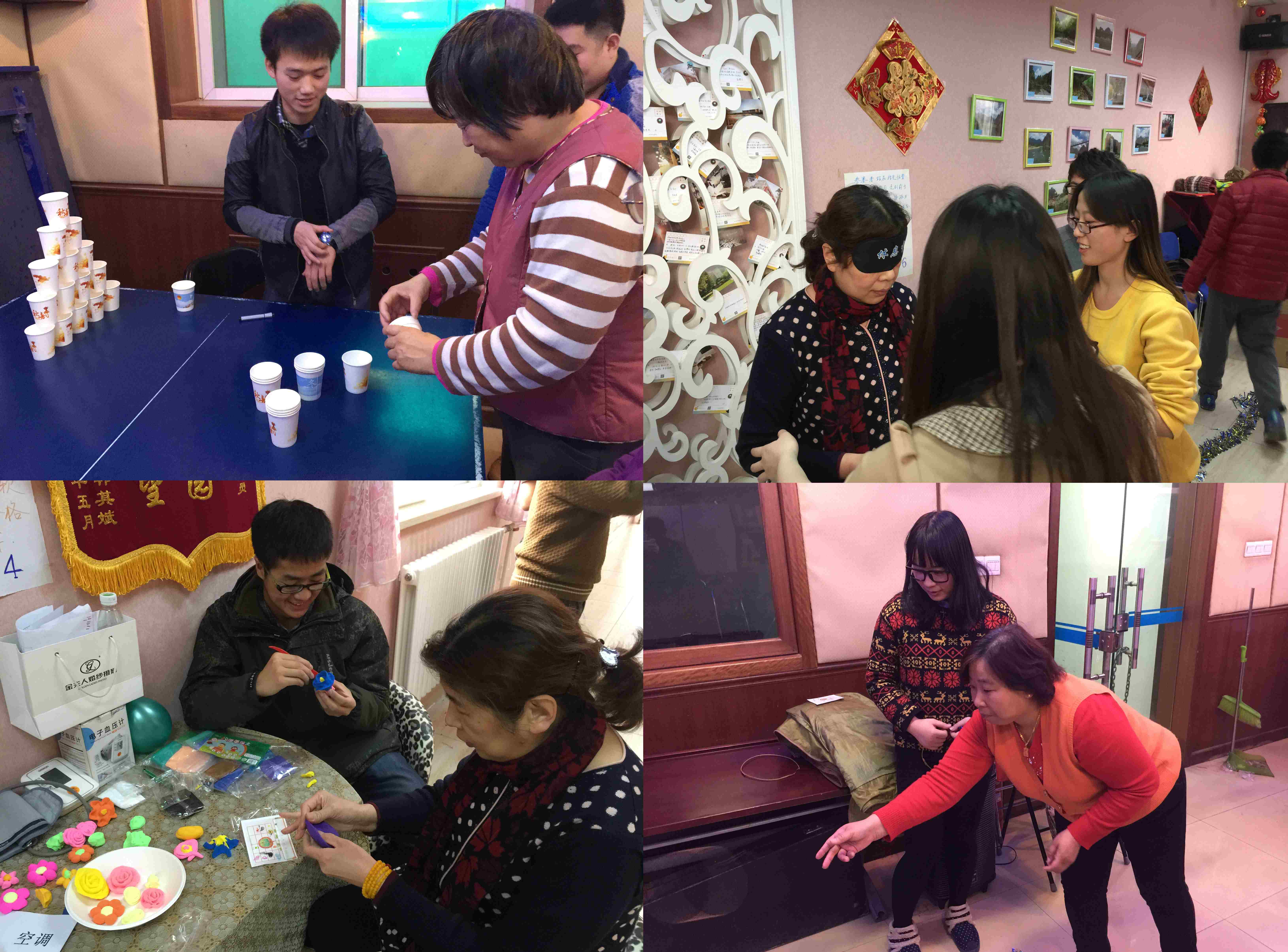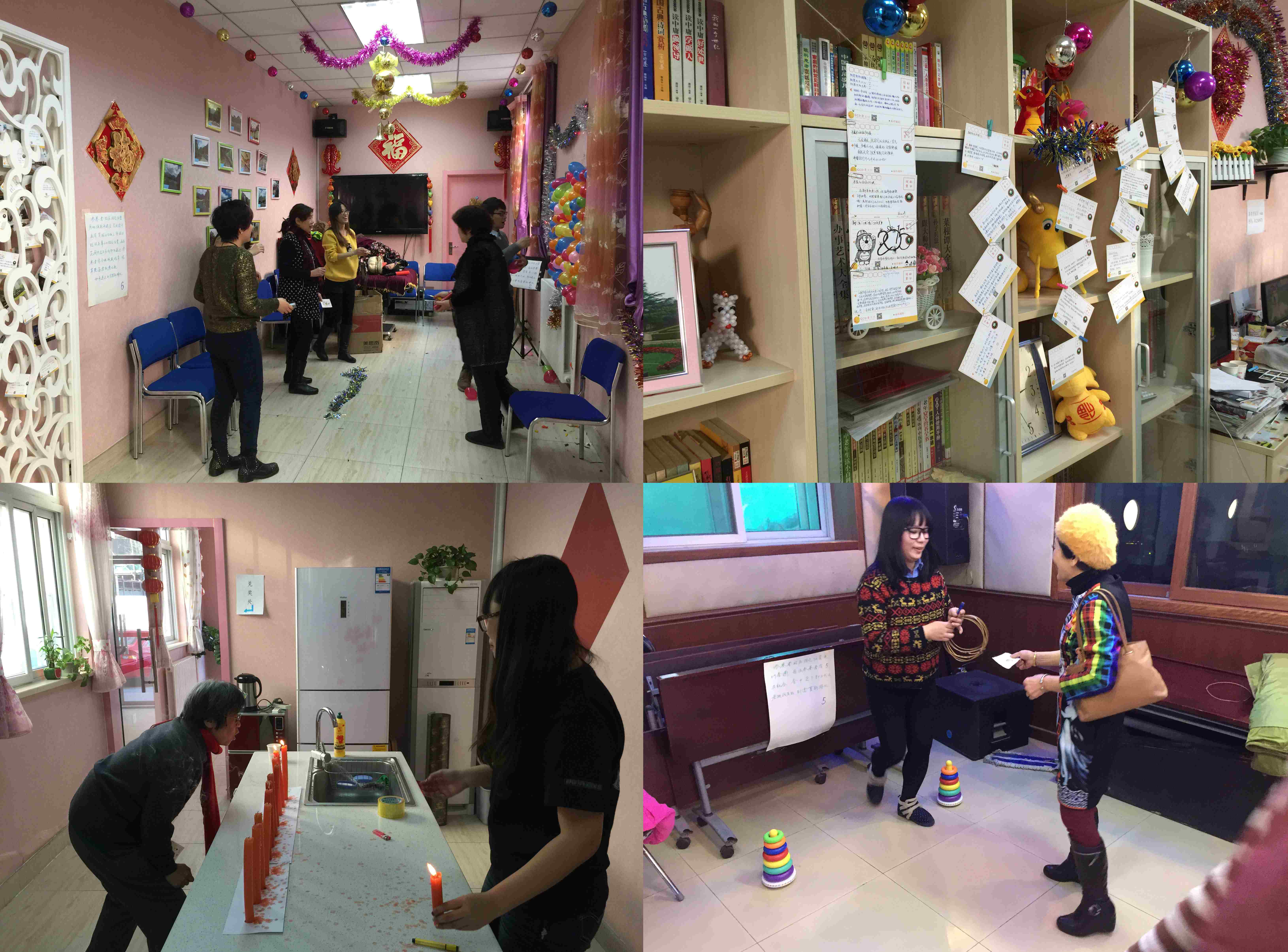 “新希望家园”是由北京市西城区展览路社区卫生服务中心与街道计生办、计生协会于2009年联合成立的全市首家以关爱“失独家庭”为目的的服务单位。6年来,在街道与社会的共同努力下,辖区内100多名失独老人不仅得到物质与心理帮助,也通过家园组织的各类活动丰富生活,得到支持和关爱。这次活动由本、硕、博学生组成,是贾晓明教授带领的失独老人关爱团队与新希望家园的一次重要合作。以适宜的、符合专业伦理的方式帮助失独老人一直是团队重视的议题,既不能在帮助失独老人过程中使他们感到是弱者,又要恰当地为他们提供需要的服务。这次活动由心理学研究生郭璞洋、杨玉婷策划,经过与街道的多次联系以及项目团队的讨论,最终确定了园游会的活动内容。博士生张宇迪、社会工作专业大四学生由耀爽、何国君、郑悦、杨楠、张旭等参与了活动前的准备,并通过社工公社平台进行志愿者招募与培训,吸纳了来自不同专业的10名同学加入到活动中。社会工作专业大三全体同学、部分大四学生,心理学一年级研究生等,也为老人们精心准备了写满祝福的明信片作为新年礼物。西城区展览路街道高鸿彦科长、李晓鹏老师也参与了整个活动。在活动中同学们摆起摊位,扮演“摊主”,以趣味闯关形式让老人们在平时熟悉的家园里感受不一样的新年联欢。