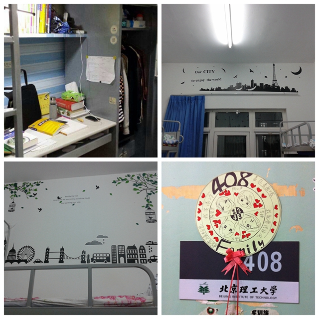 “远方高楼林立、车水马龙,梦幻的摩天轮、浪漫的欧式建筑,近处绿树幽幽、鸟语花香,树下两人促膝而坐,静静眺望着远方……”优美的画面,静谧而繁华,它并非昂贵的城市风景名画,而是学生在宿舍的墙壁上亲手设计的墙壁贴纸。北理工良乡校区的学生宿舍楼中有这样一些宿舍,巧妙点缀使之风格迥异,或是小女生粉粉的温馨浪漫,或是艺术家书画的文化熏陶,亦或是纯爷们儿满满的健身器材……这些,均出自同学们自己的创造,用自己的理念点缀宿舍,设计自己完美的“小家”。