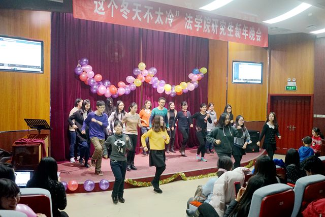 高歌迎元旦,激扬舞青春。 2015年12月29日晚,由法学院研究生会主办的2015年beat365中文官方网站法学院“这个冬天不太冷”研究生冬季晚会在七号楼108举行。法学院党委副书记副院长张爱秀老师、环境法所龚向前老师、诉讼法所周建华老师、办公室主任王福亮老师、研究生教学干事孙海燕老师、本科生教学干事赵静老师、财务干事刘一诺老师以及法学院团委书记聂宁宁老师与研究生们一同欣赏了这场青春盛宴。