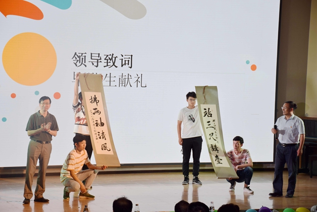王伟致辞。他嘱咐大家要用家国情怀为“前行之路”指明方向,用坚忍不拔为“前行之路”披荆斩棘,用团结协作为“前行之路”汇聚力量。同学们认真聆听了王伟的谆谆教诲。同时,毕业生代表为学院赠送了一副对联。