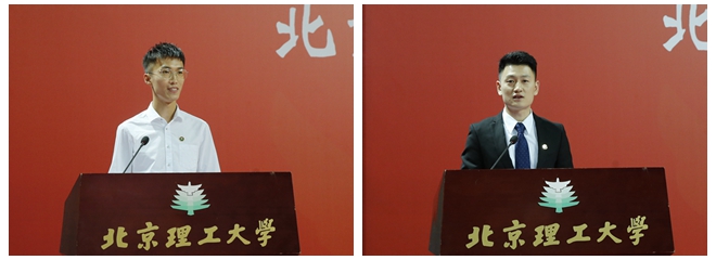 化学与化工学院博士生陈立伟代表全体2019级研究生新生发言,他表示将不忘初心,以创新为己任,勇攀学业高峰,以不懈奋斗践行新时代青年的使命。校研究生会主席、机械与车辆学院博士生赵正阳代表在校生发言,他分享了自己眼中北理工人的情怀、担当和坚持,鼓励同学们仰望学术星空、踏实求索笃行。