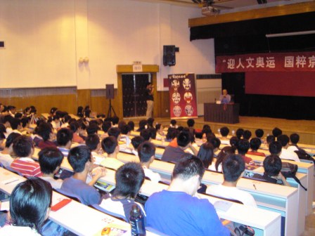 为此,生命科学与技术学院将由北京市大学生京剧协会主办的 "迎人文奥运 国粹京剧进高校"系列讲座及演出引入北理校园,作为此次系列巡演的第一场。本次讲座由北京京剧院著名导演,戏剧理论家,戏曲评论家常保全老先生担任主讲人,北京京剧院优秀青年演员担任助讲和表演,演讲以介绍京剧独特的工架武打、舞蹈身段、脸谱服装等为内容,通过具体化、形象化、立体化的示范表演,将京剧之大美、京剧之趣味,以最直接的方式一一展现在师生面前。什么是生旦净末丑,什么是唱念做打,什么是勒头勾脸,什么是扎靠披蟒,"立体式讲座"使同学们一目了然,讲座中的参与环节更是强烈的吸引着同学们参与其中,现场气氛十分热烈。