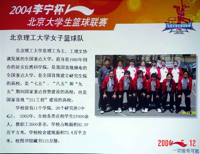 2004年5月12日下午,人民大学逸夫馆,在由北京市体育协会和北京大学生篮球协会联合主办、由李宁公司赞助的第八届北京大学生篮球联赛的新闻发布会上,来自首都11所高校的领导以联名篮球的形式宣布新一轮较量开始,大学生运动员代表更是喊出了“圆梦2008,一切皆有可能!”的高校篮球宣言。
