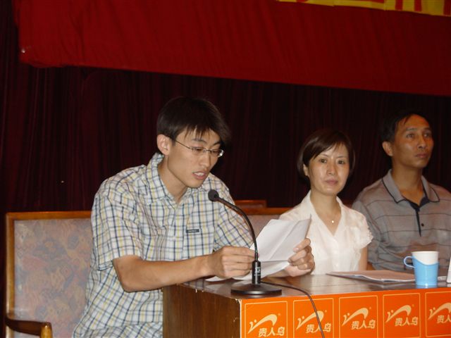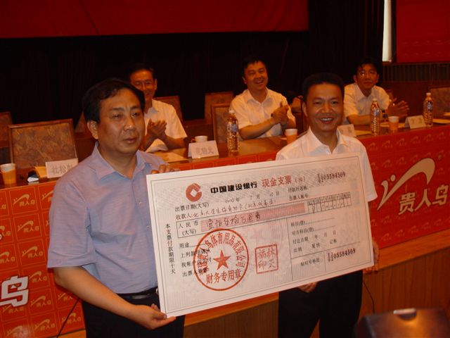 作为本届大运会北京代表团运动装备的唯一赞助企业,福建贵人鸟体育用品公司董事长林天福也到场祝贺,并亲自把价值150万元的体育装备的支票牌交到市教委副主任杜松彭的手中。