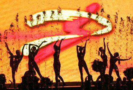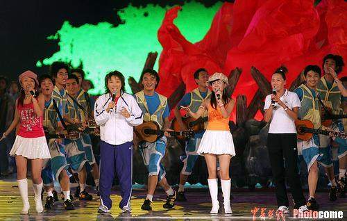 踏着青春的节奏,迈开青春的步伐,传递着青春的火炬……在《青春万岁》音乐的烘托下,6名运动员腾空而起,刹那间,焰火升腾,激情四溢。演员从四面八方涌向舞台。激光四射、焰火璀璨、一张张笑脸……万面小国旗在人们手中挥舞。台上台下青春的气息交织在一起。