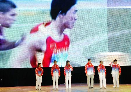 更大的惊喜引燃了全场的欢呼——杜丽、王义夫、张怡宁、张国政、王旭、陈艳青6位在本届奥运会上勇夺金牌的选手,风尘仆仆地赶来,与祖国各地的大学生一同分享青春运动盛会的欢乐。